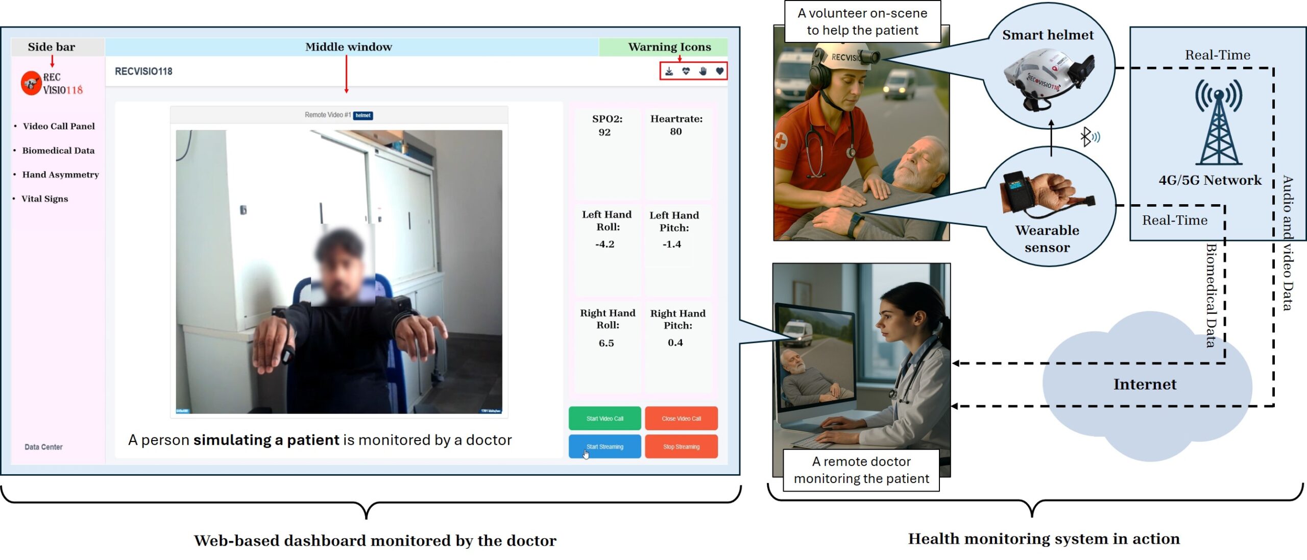 La demo coinvolge tre partecipanti: un volontario medico che indossa un casco intelligente con videocamera e microfono integrati, un paziente dotato di sensori Bluetooth (frequenza cardiaca, saturazione di ossigeno e movimento della mano), e un medico da remoto che monitora il cruscotto digitale. Se vengono rilevate anomalie — come un movimento asimmetrico della mano che potrebbe indicare un ictus — il sistema attiva un allarme immediato.